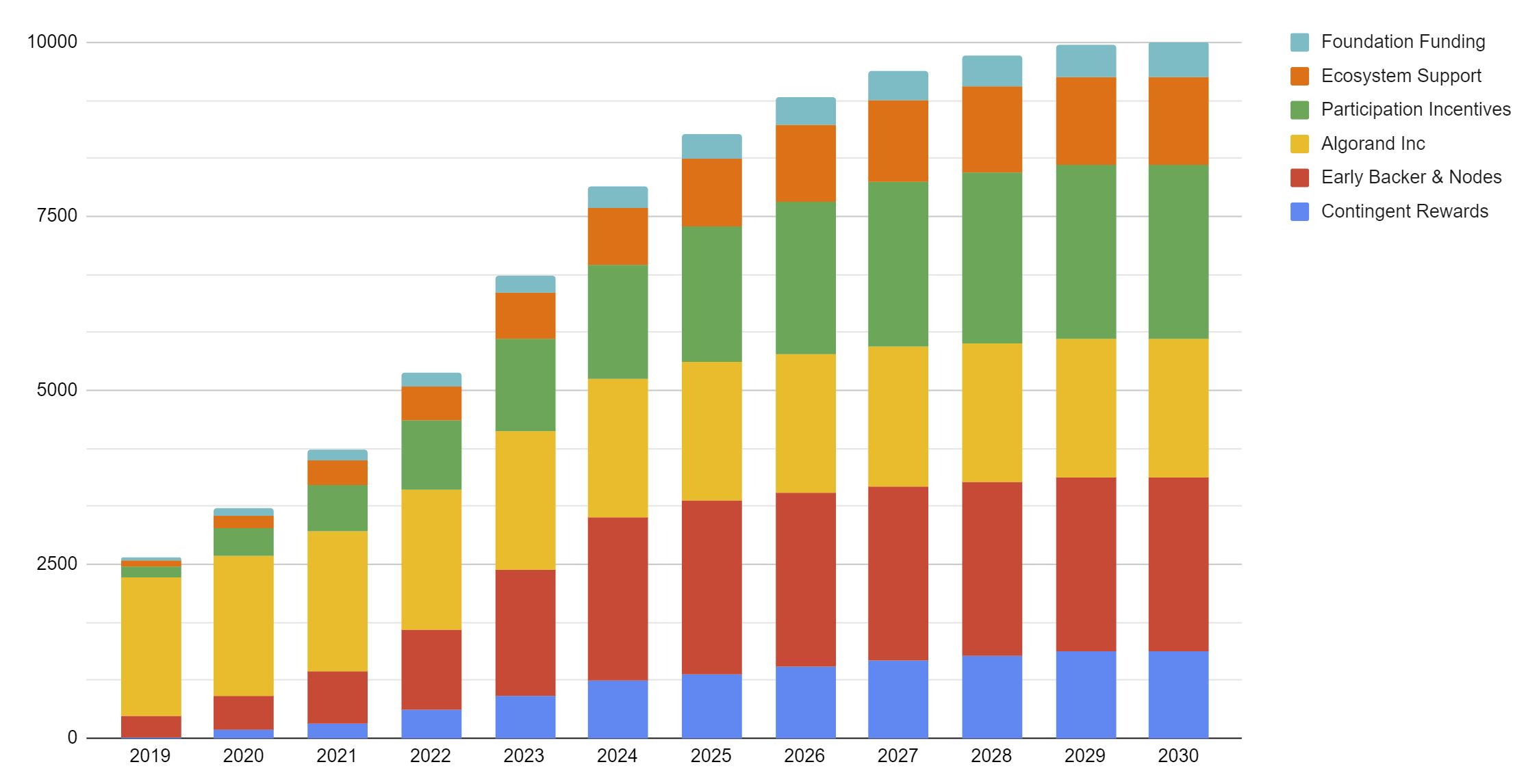 By building this 10-year program, the Foundation is providing clarity on how the outstanding supply of Algo will enter into circulation. By 2030, the Foundation expects over 99% of all Algo minted at Genesis to be in Circulating Supply according to a non-inflationary distribution rate. The “Circulating Supply” is the total supply of Algo that is available on-chain without contract restrictions. It is defined as the Total Supply less tokens held in restricted wallets (future vesting of rewards, future grants, participation rewards pools, contingent incentives, etc).